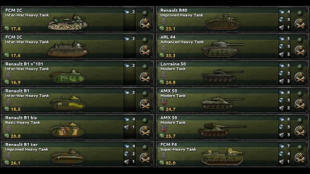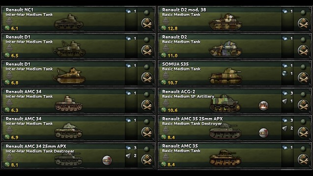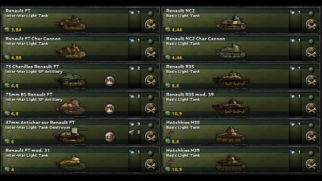 Мод «French Tank Icons Expanded» расширяет возможности дизайнера танков для Франции, добавляя более 100 новых иконок для различных моделей, включая прототипы и планы, которые могли бы быть реализованы в 1940-х годах. Франция, начиная с Schneider CA и Saint-Chammond, была одной из первых стран-производителей танков в Первой мировой войне и создала первый современный танк Renault FT. Этот мод позволяет отразить богатую историю французского бронетанкового дела, предоставляя игрокам новые визуальные элементы для танковых единиц и облегчая управление армией.