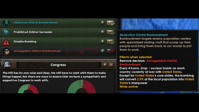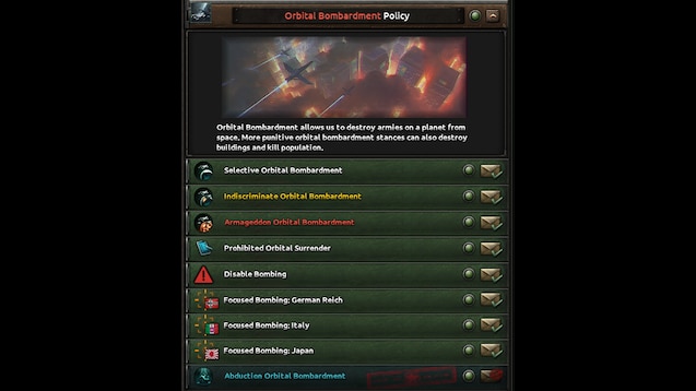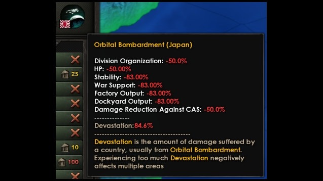 - Автоматическая орбитальная бомбардировка всех враждебных стран каждые 4 игровых часа