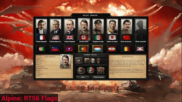 - Сборка разработана специально для работы с Road to 56 и использует графические элементы из модов Call of War и Hyper Expanded Political Overhaul (RT56).