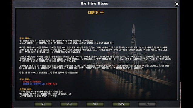 The Fire Rises: Korea Plus — сюжетно-ориентированное дополнение к моду The Fire Rises для Hearts of Iron IV, полностью сосредоточенное на Корейском полуострове. Мод переносит игрока в мрачную альтернативную реальность начала 2020-х годов, где пандемия COVID-19 изменила ход истории, а Южная Корея оказалась на грани политического, военного и цивилизационного краха. Старые союзы рушатся, регион погружается в хаос, и судьба всей Северо-Восточной Азии зависит от решений игрока.
