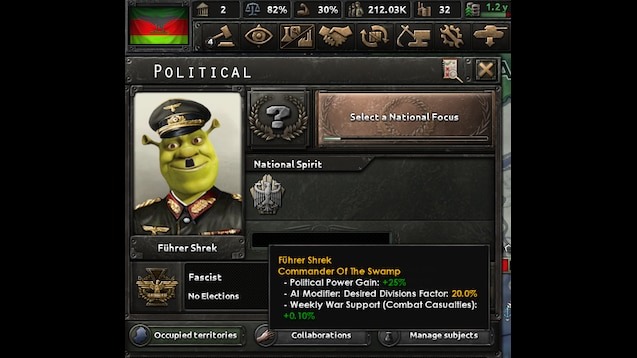 Мод «The Shrek Reich» добавляет в Hearts of Iron IV совершенно неожиданный и юмористический сценарий: Шрек захватил Сирию, и теперь игроки могут управлять самим зеленым огром в глобальной стратегии. Помимо возможности играть за Шрека, мод расширяет игру, добавляя уникальные деревья национальных фокусов для каждой идеологии и другие элементы, которые делают игровой процесс необычным и веселым.